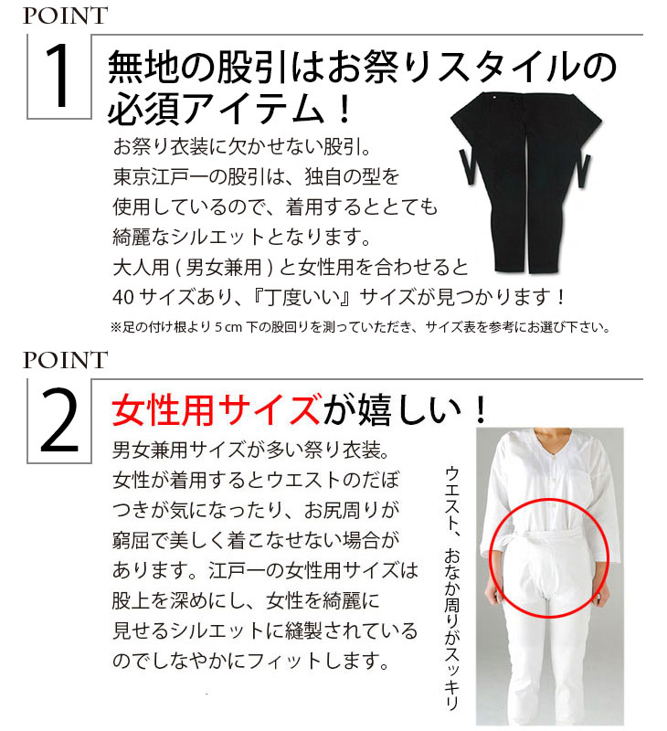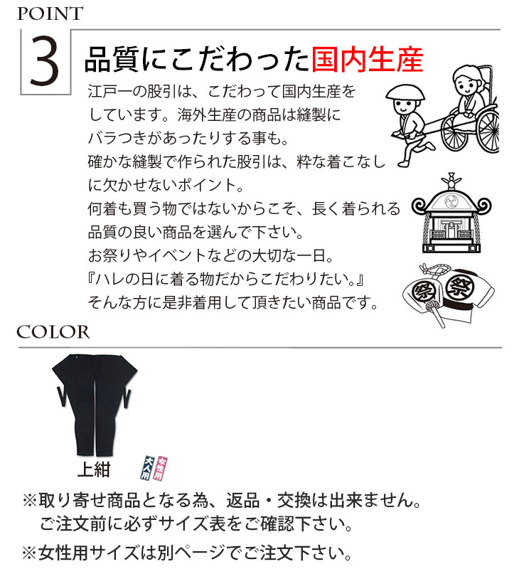 | 商品説明 | お祭りに欠かせない股引です。 サイズ豊富な東京江戸一はピッタリサイズがきっと見つかります! お祭り衣裳を粋に着こなして、素敵な時間を過ごして下さい! |
