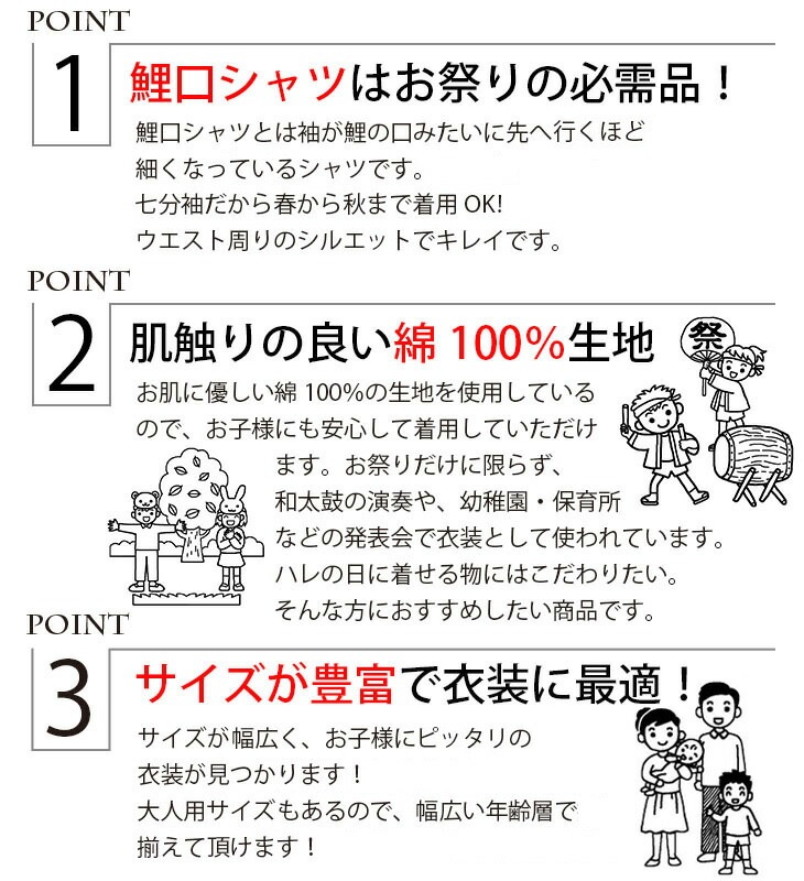 | 商品説明 | 着こなしやすいデザインの鯉口シャツは当店の大人気商品です! 日本文化を感じられる和柄は、 海外 の方への プレゼント などにも喜ばれます。 また、大人用サイズのあるアイテムもあるので幅広い年齢層で合わせる事も可能です!! 鯉口シャツ は、袖が鯉の口みたいに先へ行くほど細くなっている シャツ です。 七分袖 で 春 から 秋 まで着用していただけます。ウエスト周りも細身のシルエットでキレイです。 無地の鯉口シャツでは物足りなくなった、洗い替えにもう一枚欲しい、 個性的 なスタイルに挑戦したい…そんな時にお買い得価格の鯉口シャツをご利用下さい! また お祭り アイテム としてだけではなく、町内、 保育園 、 幼稚園 、学校などでの イベント や 行事 の 衣装 など、色んな用途でお使いいただけます。 是非この機会にお買い求め下さい! |