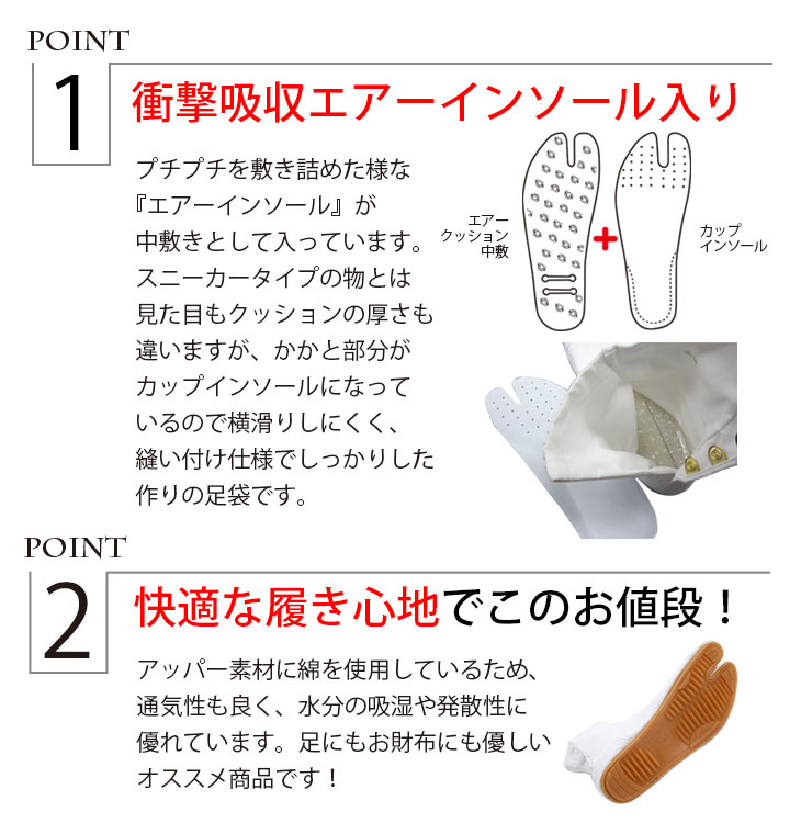 | 商品説明 | エアークッション 入り 地下足袋 をお買い得価格で発売中! プチプチを敷き詰めた様になっている『エアーインソール』が中敷きとして入っています。 「 エアークッション の地下足袋は欲しいけど、4,000円~5,000円出すのはちょっと…」という方にオススメです! スニーカータイプの物とは見た目も クッション の厚さも違いますが、カップインソールになっているので横滑りしにくく、縫い付け仕様でしっかりとした作りの足袋です。 スッキリした見た目と5枚コハゼで脱ぎ履ぎしやすいので女性の方にも人気の商品です。 同じ値段で普通の クッション の 地下足袋 を買うならこちらがオススメです!!! |