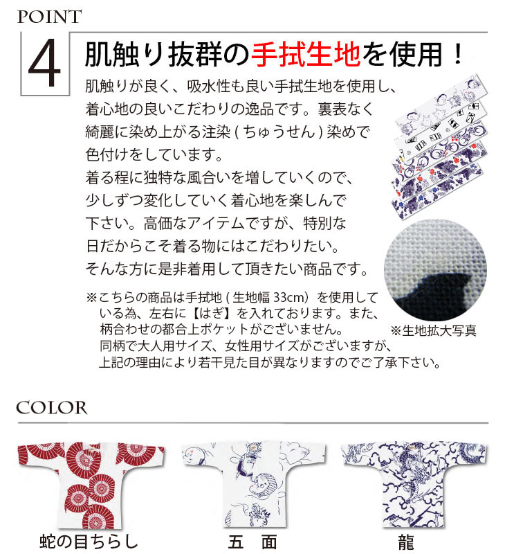 | 商品説明 | 鯉口シャツでお祭りに出かけませんか? サイズ豊富な東京江戸一の鯉口シャツは、同じ柄の大人用サイズや女性用サイズが充実! 親子でお揃いのスタイルも可能です! 手拭生地なので柔らかく、肌ざわりが良いです! 柄入りの鯉口シャツは粋なお祭り衣裳として大人気! 是非この機会にお試し下さい! ※子供鯉口シャツ【手拭】は、手拭地(生地幅33cm)の為、左右に「はぎ」を入れております。 ※子供鯉口シャツ【手拭】は、柄合わせの都合上、ポケットを付けておりません。 ※子供鯉口シャツ【手拭】は、注染染のため多少の染めむらはご了承下さい |