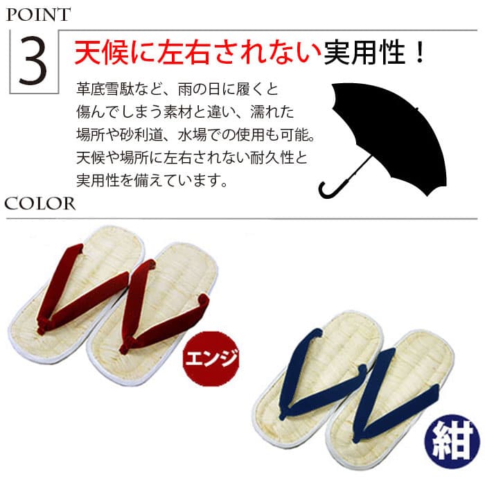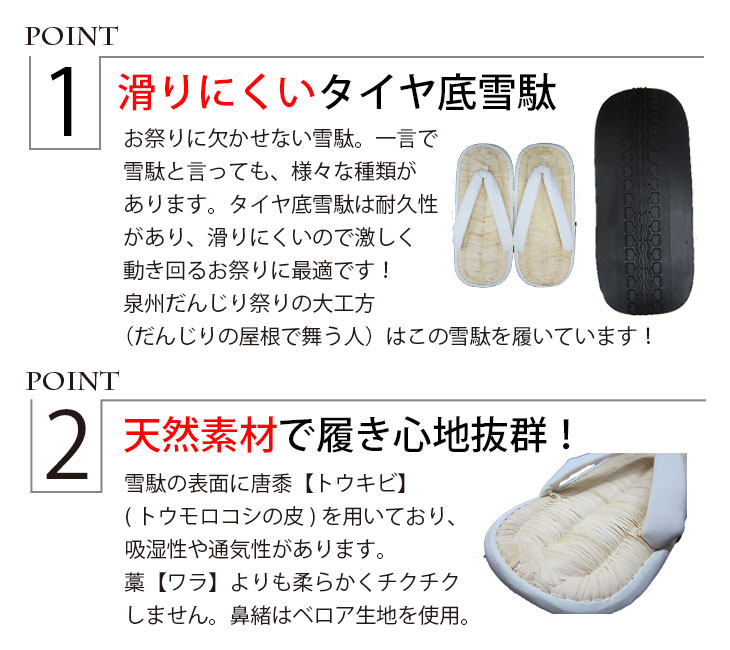 | 商品説明 | 鼻緒は 綿 生地を使用。 雪駄の表面は 唐黍 【トウキビ】(トウモロコシの皮)を用いており、吸湿性や通気性があります。 また、藁【ワラ】よりも柔らかくチクチクしません。 タイヤ底 は 滑りにくい ので、雪駄で踏ん張ったり、高所に登る方にも オススメ です。 大阪・泉州 だんじり祭り の 大工方 (だんじりの屋根に乗ってうちわを手に指示を出し舞っている人)は、この滑りにくいタイヤ底雪駄を履いています! |