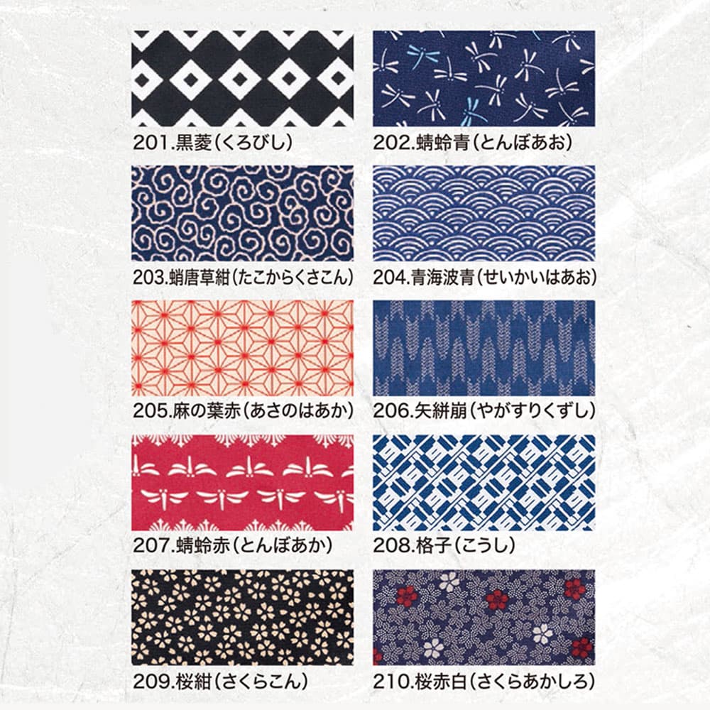 | カラー | シャツ:黒菱 / 蜻蛉青 / 蛸唐草紺 / 青海波青 / 麻の葉赤 / 矢絣崩 / 蜻蛉赤 / 格子 / 桜紺 / 桜赤白 ズボン:白 |