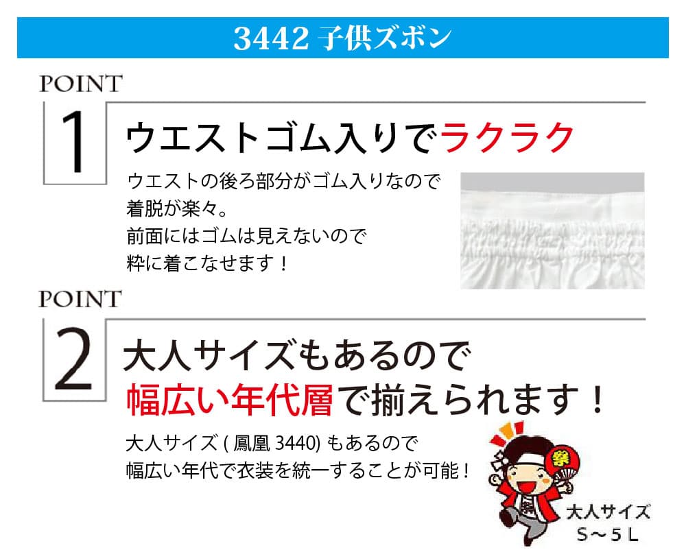| 商品説明 | 大人サイズもあるので、幅広い年齢層で揃えられます。 素肌の上からそのまま着用し、汗によるハッピのベタ付きを解消します。 |